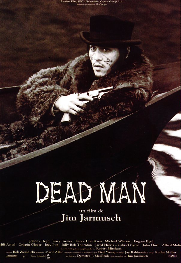 Der Titel "DEAD MAN" ist in einem knochenartigen, stilisierten Schriftzug dargestellt, der die Vergänglichkeit und die morbide Thematik des Films unterstreicht. Die Namensnennung von Jim Jarmusch als Regisseur und die Liste der prominenten Darsteller wie Gary Farmer, Lance Henriksen und Iggy Pop weisen auf einen künstlerisch anspruchsvollen und unkonventionellen Western hin.