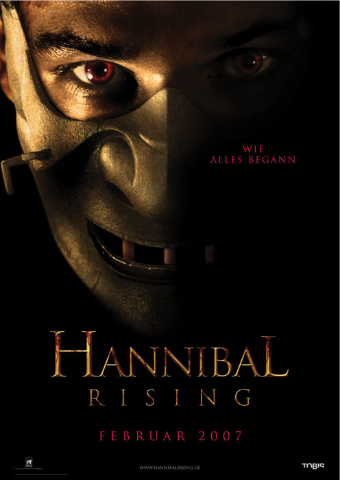 Über dem Gesicht steht in kleiner, roter Schrift der Slogan "WIE ALLES BEGANN" (Wie alles begann), der auf die Ursprungsgeschichte des berüchtigten Hannibal Lecter hinweist. Darunter prangt der Filmtitel "HANNIBAL RISING" in einer goldenen, metallisch wirkenden Schrift, die sowohl Eleganz als auch eine gewisse Härte ausstrahlt.